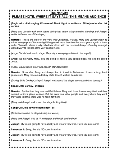 This resource includes a list of the characters you d need to cast and each scene in the play is split up clearly with narrators to keep the flow of the play going encourage young children to get involved in the yearly retelling of the christmas.